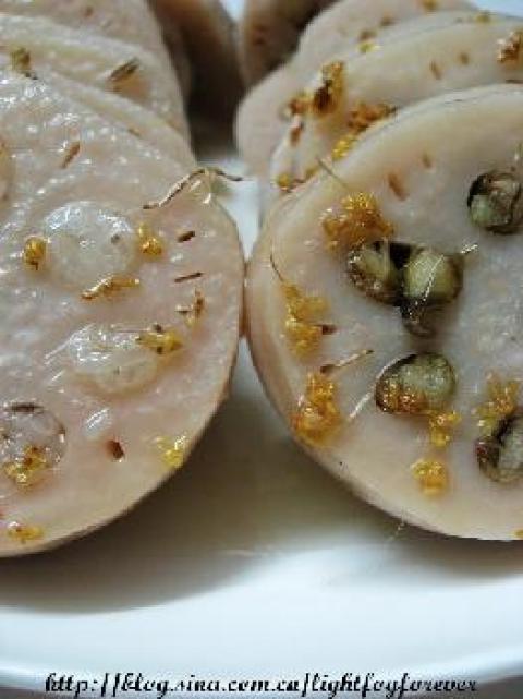 3.莲藕取出,待凉后切片,刷些蜂蜜汁,撒点桂花即可。remark:甜甜糯糯的,保证让你一吃就爱上藕。