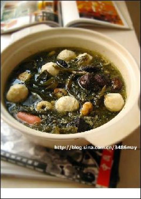 3.再开大火,放入香菇,肉丝,海带丝,鱼丸,虾仁,烧开后即可。