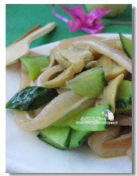 3.黄瓜片晾干水,姜蒜爆香油锅,放黄瓜片用筷子炒(用锅铲怕弄碎)几下后倒入调配好的鲍鱼汁慢慢焖煮入味。