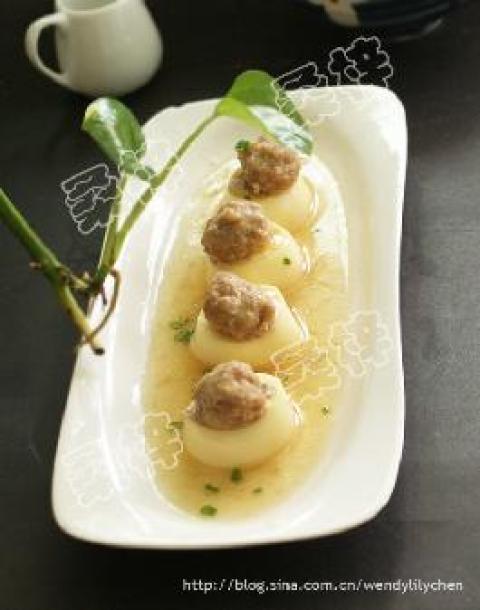 日本豆腐3条,肉碎适量,荸荠3个,葱花少许,生抽,盐,姜末,生粉,胡椒粉