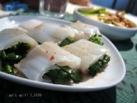 1.粉本身油油的,韭菜洗干净后用盐抓一下,然后去掉头尾,用粉卷起,大火蒸熟,切块,淋上酱汁即可。