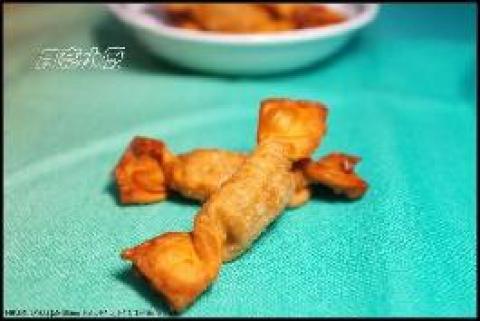 3.轻轻捏起两端 做出一些皱褶 形成糖果形状 用橄榄油炸至外皮金黄即可捞出 用纸巾吸去多余油份即可。