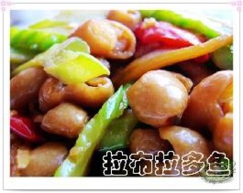 主料:鲜大肠头500克。调料:色拉油50克,盐4克,味精2.5克,整干椒、草果、八角、桂皮各5克,料酒15克,姜块、葱结、红油各20克,生粉10克。
