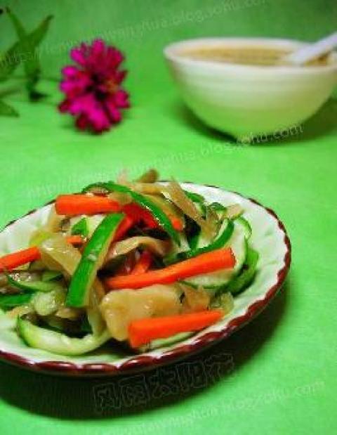 2.油锅热油爆香花椒后捞出不要,然后下葱花炒出香味,放榨菜、萝卜丝、黄瓜丝一起翻炒几下出锅。