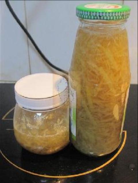 10、放凉之后柚子茶的颜色又会出现变化,然后加入适量蜂蜜,装瓶完成制作