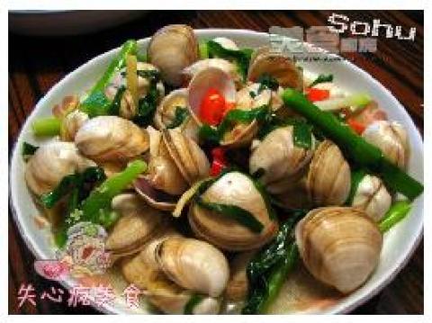3.加入已吐净沙的白蛤,翻炒,调入适量料酒,加入少量水,加盖闷烧一会(为了让白蛤开口笑哦!)