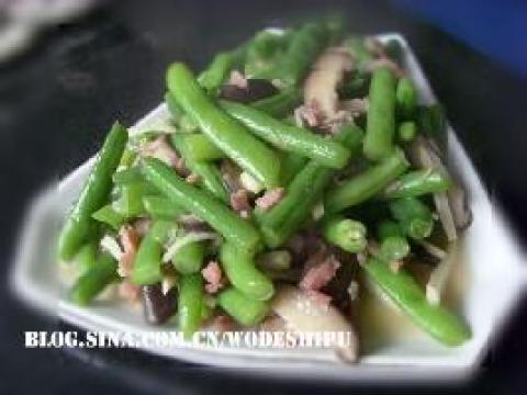 四季豆一斤,香菇3朵,火腿末50克,冬笋20克