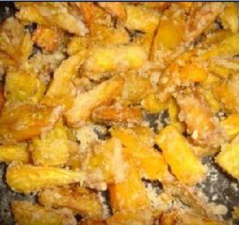 (1)将芋头切成6厘米长、2.5厘米宽的条状后,把炒鼎洗净上火,放入生油,侯油温热至约180℃时把芋头放入鼎里,炸至金黄色(要炸熟)捞起。