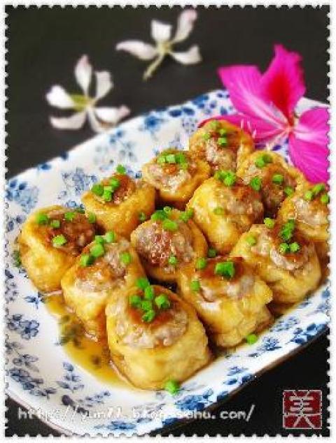 第一种:美食美味的煎酿油豆腐——金镶玉,春点绿做法