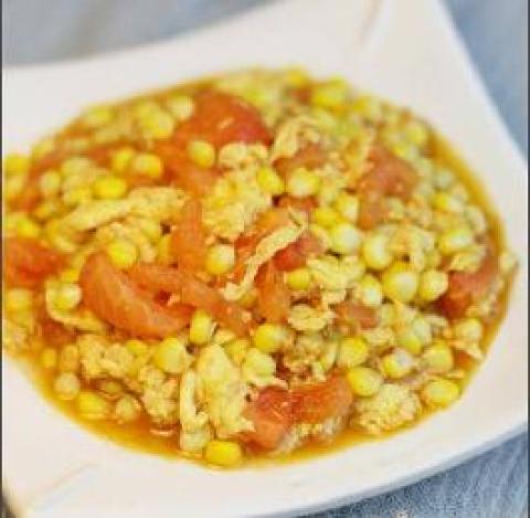 3.锅烧热,放油,至7成热,下鸡蛋炒到伤愈少量蛋液的时候,倒入西红柿和玉米粒翻炒至西红柿少量出水,调入少量西红柿酱和盐,再加少量水(一调羹左右),放少量鸡精调味即可。