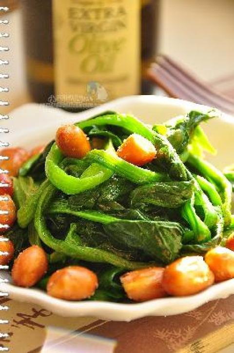 1.干锅炒花生至香。菠菜洗净,用开水打焯