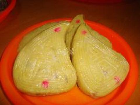 3.把面团分成剂子,包入绿豆瓣,用模具压成桃成,上锅蒸锅即成。