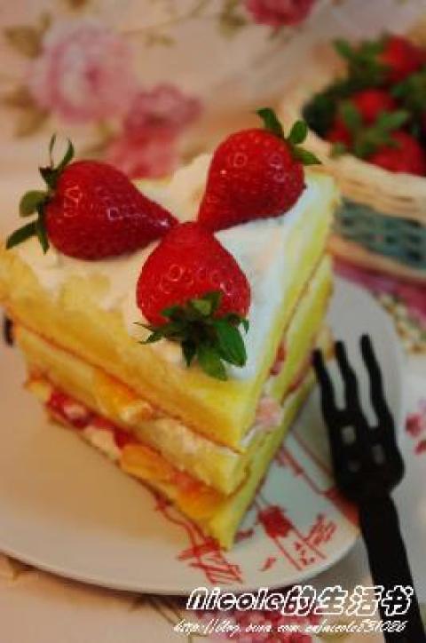 6.再次按下煮饭键,待煮饭键再次跳起,再次用毛巾捂住出气孔,焖20分钟后,热腾腾的蛋糕就出锅啦;各种水果切丁,拌入自制酸奶;蛋糕等分为6份,取一份,均匀铺一层水果酸奶;加盖蛋糕,再均匀铺一馅料