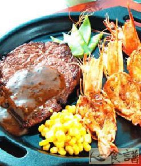 牛排1片,大虾2只公克,洋葱末50公克,奶油4大匙,黑胡椒酱240cc,梅林辣椒酱2大匙,水30cc