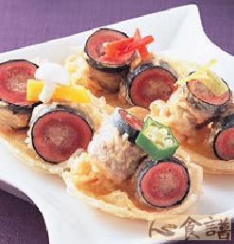 3.取一油锅并将油温烧热至175℃,再把作法2的材料放入油锅中,油炸约3分钟至酥即可捞起摆盘。