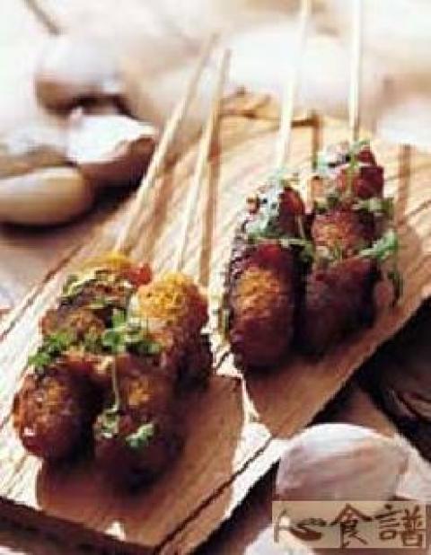 (3)刷上烤肉酱烧烤入味,再加入咖哩粉、辣椒粉,口味则随个人喜好。烤好后在v字开口处夹入已洗净的香菜叶即可食用。