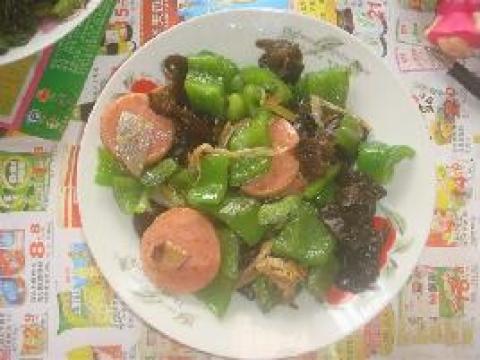 青辣椒3根,火腿6片,黑木耳1朵,盐1小匙,糖1/3大匙,香油1/3大匙