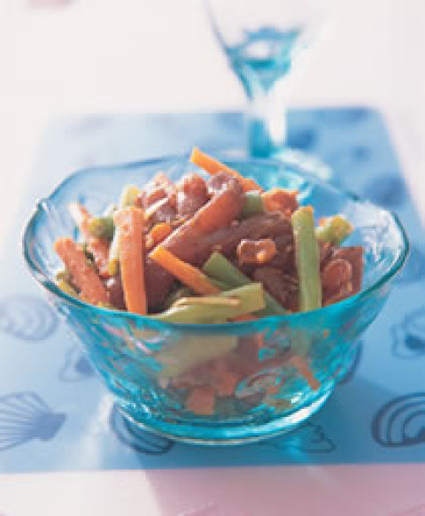 (2)将四季豆段与红萝卜段汆烫至熟,捞起沖冷水后,再沥干水份备用。