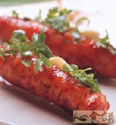 5.在香肠表面刷上酱油膏和蚝油,将蒜茸、香菜填入香肠划开处即可。