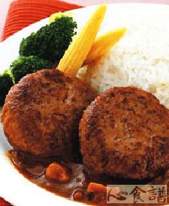 4.取一盘,排入作法3的汉堡排,淋上辣味咖哩酱,并附上白饭一起食用即可。