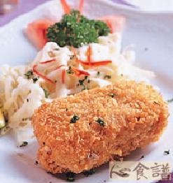 1.将里肌肉拍成薄片,将烟燻起士片、火腿片、沛克力诺起士夹在两片里肌肉中间,整个依序沾裹低筋面粉、打散的蛋汁、面包粉备用。