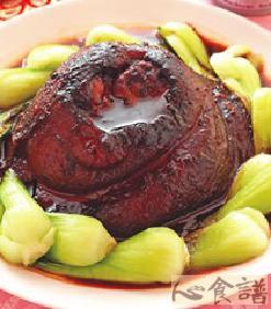 5.将作法2的青江菜烫熟后舖在盘底,将作法4的蹄膀取出扣在盘中。