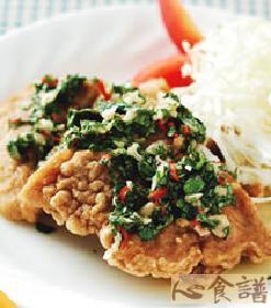 3.热锅加入少许沙拉油,以小火爆香蒜末、作法2九层塔碎、辣椒末,加入所有调味料煮开后起锅淋至作法1香炸猪排块上即可。