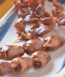 3.将鸡心和鸡胗放凉后,3个鸡心串成1串,鸡胗切成小块状后,再2个串成1串。