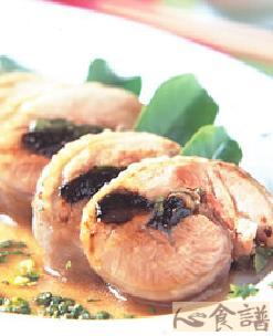 5.将作法3中的鸡腿肉摊平,放上作法1的梅肉,再像寿司作法一样捲好,并以棕绳綑绑缠紧后备用,再放入锅内蒸10分钟。