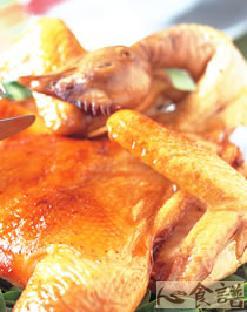 4.将作法2中烤熟的整只鸡取出,以滚油淋烫的方式,将鸡只外皮淋烫至呈现金黄色的酥脆外皮即可。