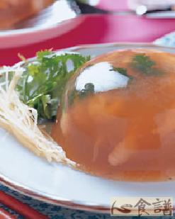 16.最后把尚未凝结的鱼胶片、琼脂液倒入杯内,与杯平面,冷却凝固后放入冰箱,食时轻轻倒出,覆扣排列在碟中即成。