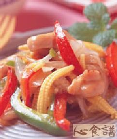 4.起一锅,放进作法1的鸡柳,以火煎2分钟,放洋葱、红椒条、青椒条、玉米笋条略炒,再加入烧肉酱,以火炒约1分钟即可。
