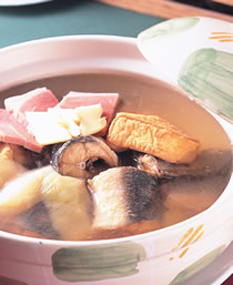 白鳗1尾,蛋豆腐1/2盒,咸菜6两,家乡肉4两,高汤2斤,盐适量,味素适量,米酒适量,姜片适量,胡椒粉适量