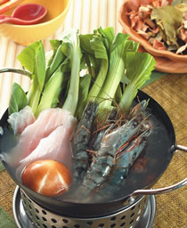 锅底:3根,柠檬叶6片,虾米10公克,鸡高汤5000cc,火锅配料:适量,鸡肉适量,青花菜适量,高丽菜适量,香菇适量