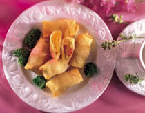 (5)用热油中火,放入橘月春捲,一一炸至金黄色,改大火30秒后再起锅,可避免吸入过多油份,再捞起沥干油,排放入盘中即可。
