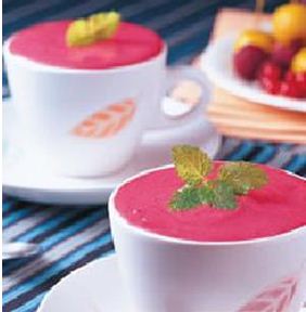 红罂粟果泥267公克,细砂糖133公克,吉利丁片14公克,白兰地酒25公克,动物性鲜奶油360公克,装饰用红罂栗泥适量