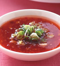 辣椒酱1大匙,细砂糖1大匙,白醋1大匙,蒜泥1小匙,葱花1大匙,热开水1大匙,香油1小匙