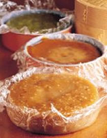 (1)将所有的材料混合搅拌均匀,再倒入垫有玻璃纸的圆形模型当中,放入蒸锅中以大火蒸2小时即可。