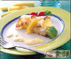 生香菇2朵,绿芦荀6根,小玉米6根,红萝卜1/2条,芹菜适量,花枝50公克,虾仁10尾,巴西里少许,汤碗1个,1.盐2小匙,糖1/2大匙,2.沙拉酱3大匙,蛋黄1个,白奶精1/2大匙,糖1/2大匙,3.洋菜粉1小包,水3杯