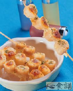 4.)烤箱温度设定为250℃,再将干贝串放在烤盘上,放入烤箱中烤约10分钟左右即可取出,撒上巴西里末即完成。