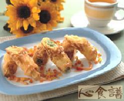 (4)待所有馅料熟透即可捞起沥干,排盘后淋上千岛酱,并洒上切碎的红椒及黄椒末作为装饰。