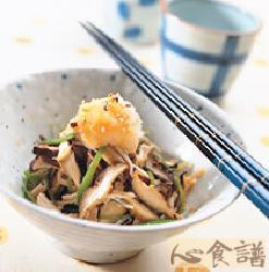 将香菇丝、鸡肉丝、豌豆荚丝与所有调味料混合拌匀,放上萝卜泥、撒上白芝麻即可食用。