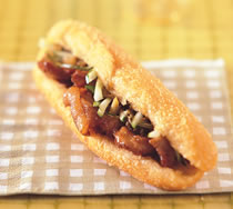 3.将小黄瓜丝、炒酸菜、炸猪排全部包入炸面包的中间开口处即可食用。