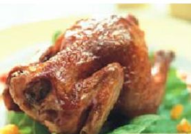 (3)以汤杓不断地舀作法2的酱汁淋在作法1的春鸡上使之均匀入味,再将鸡吊挂一旁通风处约2小时备用。