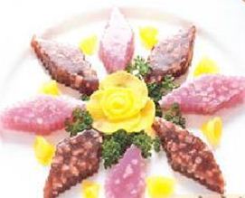 3.将山药丁与葡萄原汁加入作法2材料中煮开,倒入方盘中冷却凝固,切成稜状即可。