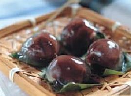 4. 将作法1的红豆馅放入作法3的粉浆中,均匀沾裹后放至粽叶上,再一起放入蒸笼中以大火蒸约4分钟至外表呈透明状,取出待凉后,再放入冰箱冷藏约10分钟即可。
