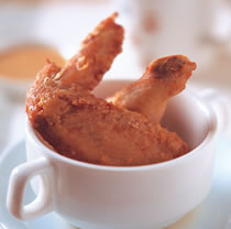 3.将作法2的鸡翅放入中温170℃油锅中,炸至呈金黄色即可捞起,沾着腐乳酱食用。