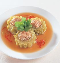 3.将肉馅镶入作法1的苦瓜内,排入刷好油之盘中,再加入调味料b及调味料c,用强微波加热15分钟即可。
