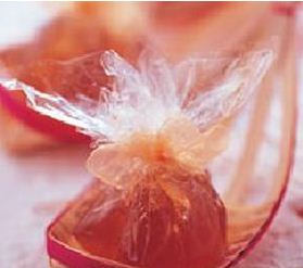 2.将作法1的果冻液,趁热倒入玻璃纸中,用缎带绑成球状,等冷却后,即可放入冰箱冷藏。