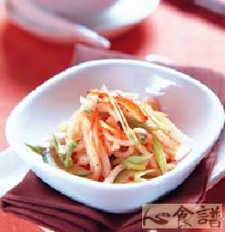 (2)白萝卜洗净去皮切丝,也可以用网目较粗的刨丝器刨丝。